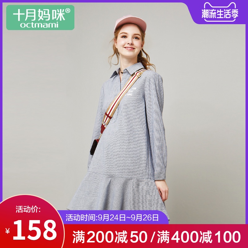 十月妈咪孕妇秋装时尚款孕妇全棉条纹连衣裙秋天裙子潮妈秋款
