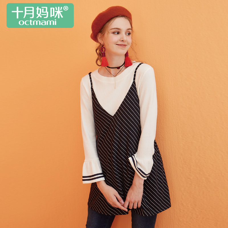 十月妈咪孕妇秋装时尚款孕妇t恤秋季针梭假两件宽松潮妈上衣